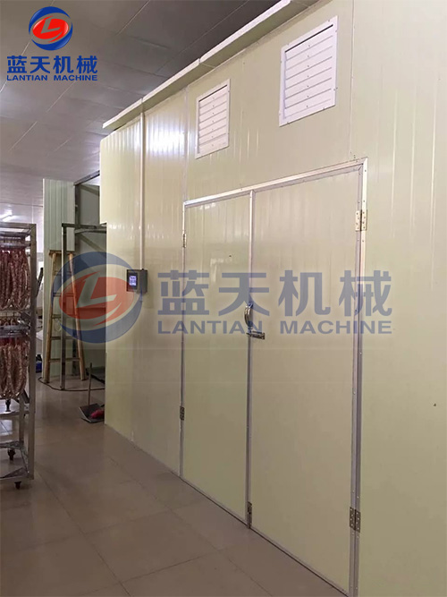 1、等速干燥階段。歷時5到6個小時,在物料裝入烘干房后兩小時內,溫度快速升到60℃~65℃,不用排濕。這一過程主要是起到一個發酵的過程,控制肉不變色變味。預熱時間后,調節溫度到45℃~50℃。