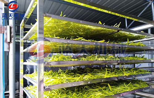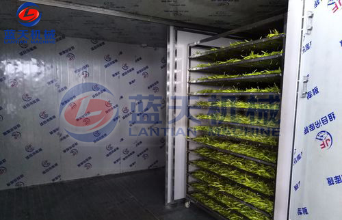 先把黃花菜均勻的攤放在推車托盤上,推車托盤最要用不銹鋼制作的,有利于加快干燥的時間。每層大約攤放7公分厚。層與層之間要預留8公分的距離,確保每層的通風效果。一部推車最好不要超過15層。裝好后放在烘干房內。