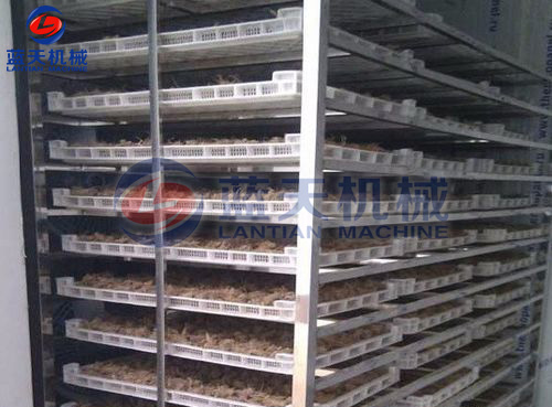 2:先將采收的文山三七挑選裝盤,使用不銹鋼托盤、合理均勻?qū)⑷邤[放至托盤架中,每層間隔約為10厘米至15厘米,不宜鋪放太多,擺放以通風(fēng)透氣為佳,這樣每一層三七都能均勻受熱、干燥脫水。