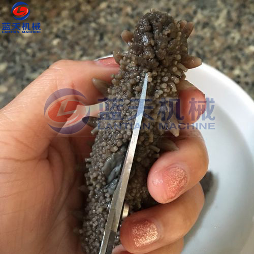 第一步:海參剪口擠腸:海參用清水清洗一下,從其腹部用剪子剪開兩三厘米的口,將內(nèi)臟及腸子取出,不去掉腸子,整個海參都會化掉。