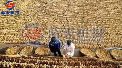 推進黨參烘干房內進行烘制。將搓理條后的黨參、均勻鋪放于竹簾內,分層擺放,蘆頭部分蓋前排的尾須部分,呈覆瓦狀,以便頭尾干燥均勻,保持40-50攝氏度進行烘干。