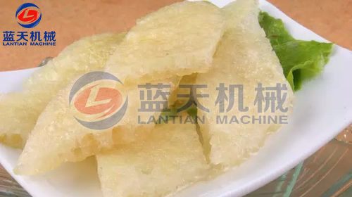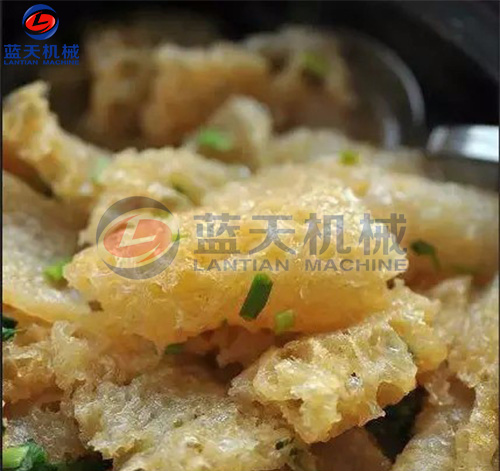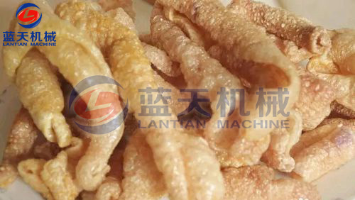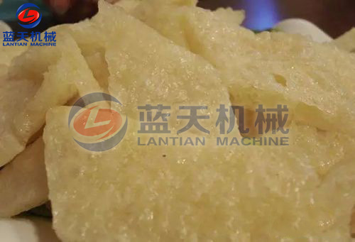 在油爆漲發前,豬皮需要在溫油中回軟,這是能否漲發的關鍵,油溫應該掌握在40-50度左右,溫度高了也會影響漲發的程度,是否回軟達標、視肉皮軟塌程度確定,這項操作標準在文字上無法準確清楚表述,只有在加工過程中熟能生巧,最終生產加工經驗是主要的?;剀浐蟮拇捅馄摫3只剀洜顟B不能回硬,將鍋中油溫升到80度后即可將肉皮放入油鍋中,邊翻動邊加溫,油溫達到120度時豬皮就可以漲發好了,在漲發時油溫應掌握好,不得過高,關鍵是保持不焦不老不黃的感官程度和完全漲發開的標準,完全漲發后的皮肚,從熱油鍋內撈出后應當控盡油脂并冷卻到常溫后方可包裝。不得未控盡油脂和降低溫度就進行包裝,否則既影響包裝又影響產品質量。