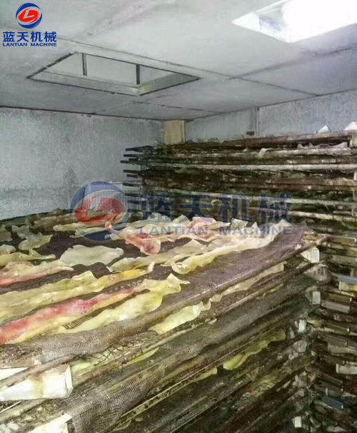 可選用煺毛后的、無疫病、無疤痕的豬皮。先將剝下的豬皮放入溫水中浸泡30分鐘,然后用竹刷或塑料刷刷洗,用刀刮除表皮上的污物,修凈污物,去凈雜毛并采取連根拔除的方法,盡量不用利刀刮毛的便利方法,避免將毛根留在肉皮內而影響成品品質,將殘留的肉皮表面的脂肪用刀修理干凈,要求不得殘留一絲脂肪,以免影響油爆漲發的程度,然后將清洗干凈、已去除脂肪的豬皮進行分切整形(有些地區的傳統工藝需要蒸煮后在分切),分切快形大小在5-10平方厘米之間,不得超過10平方厘米,否則油爆漲發后包裝困難,小于5平方厘米的自然皮塊也可以加工,無需再切成小塊和整形,否則經包裝、運輸、銷售環節后容易造成碎塊,根據市場需求也可以將豬皮切絲、切丁等形狀,以滿足不同的客戶需求,將切好的皮塊放入物料網格盤,將物料網格盤像抽屜一樣插入物料車,將物料車推入烘干房,關閉封閉門,烘干就可以開始了。