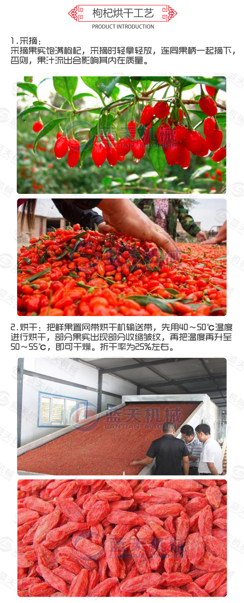 2、枸杞網帶烘干機烘干出來的枸杞色澤優于自然晾曬的色澤,色正味純、細密、無黑斑,可滿足烘干各種產品要求,有效地保證了烘品的自然品質。