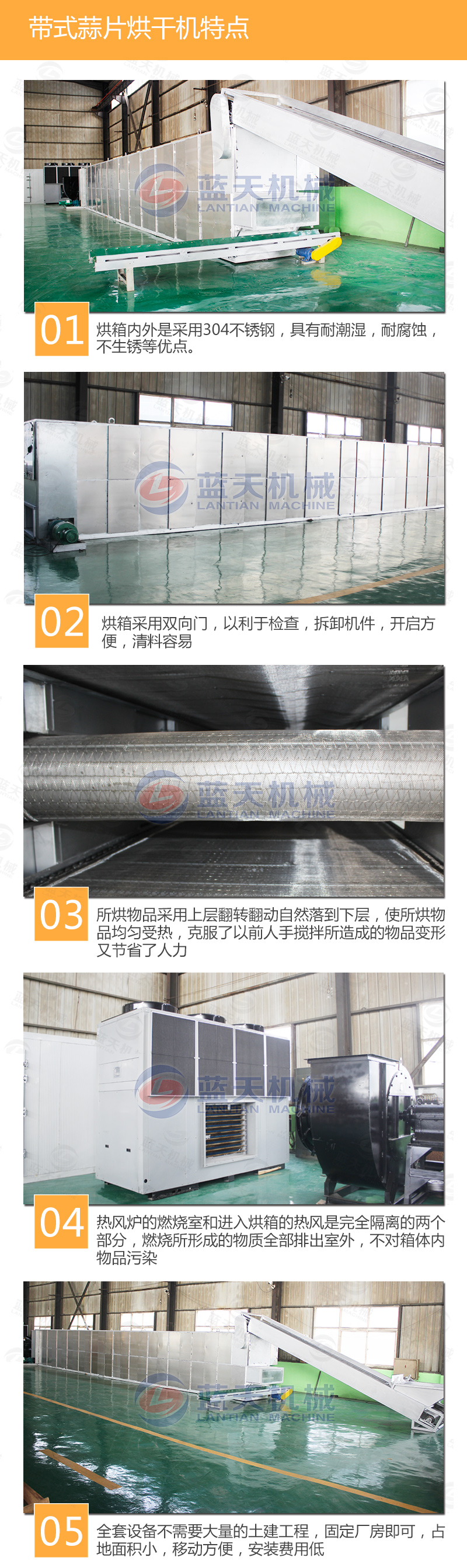 網帶式蒜片烘干機為全不銹鋼設計,精密壓鑄造鋁質外殼,表面光滑,保溫性能好,靜音風機,可選配入風濾清器,確保原料清潔度,桶體、機座均設有視料窗,可直接觀察內部原料情況,電熱筒彎形設計,避免因原料粉屑堆積底而引起燃燒,采用比例式偏差指示溫控器,可準確控制溫度。大型蒜片烘干機不僅適用于蒜片、姜片的烘干干燥,而且適用于各種谷物類、蔬菜類、青草飼料類、中藥材類、水果等物料的烘干干燥,效率高,成本低,省工省力。