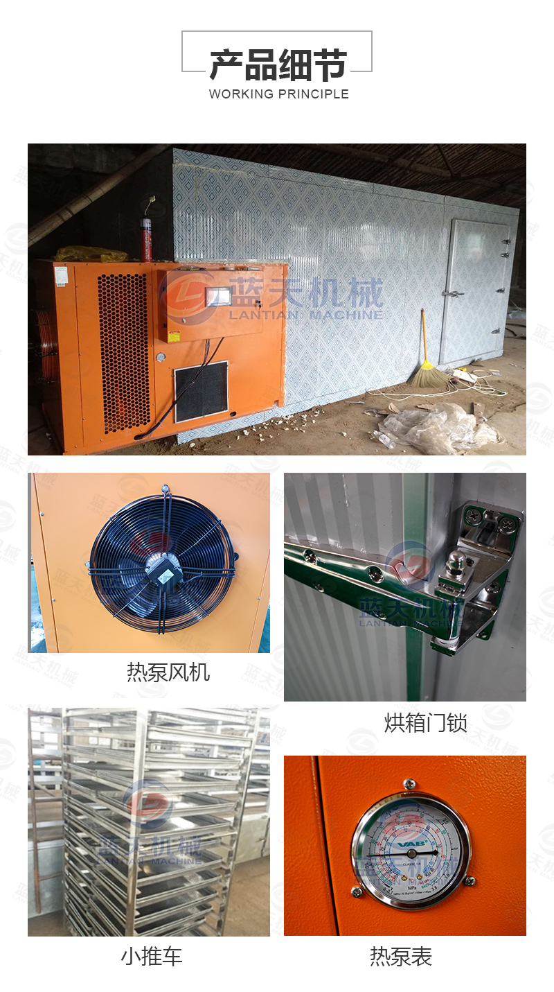 新鮮山楂片的含水率約為80%,烘干的目標含水率約為13%,使用空氣能熱泵小型山楂片烘干機,將智能溫度設定為55度左右的范圍,使山楂片所含的游離水大量蒸發,熱風循環系統不斷輸送新風,將風量均勻的輸送到各層架,排風,促使蒸發的水份通過凝結水管路系統排出。