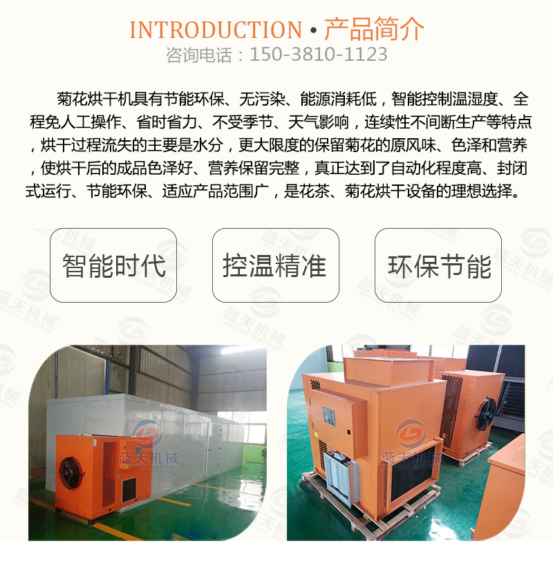 三、烘干品質好,熱效率高。菊花烘干機設備采用電加熱,烘干溫度穩定,以及特有控制系統,能準確控制烘干機的溫度,因此,烘干菊花品質好。