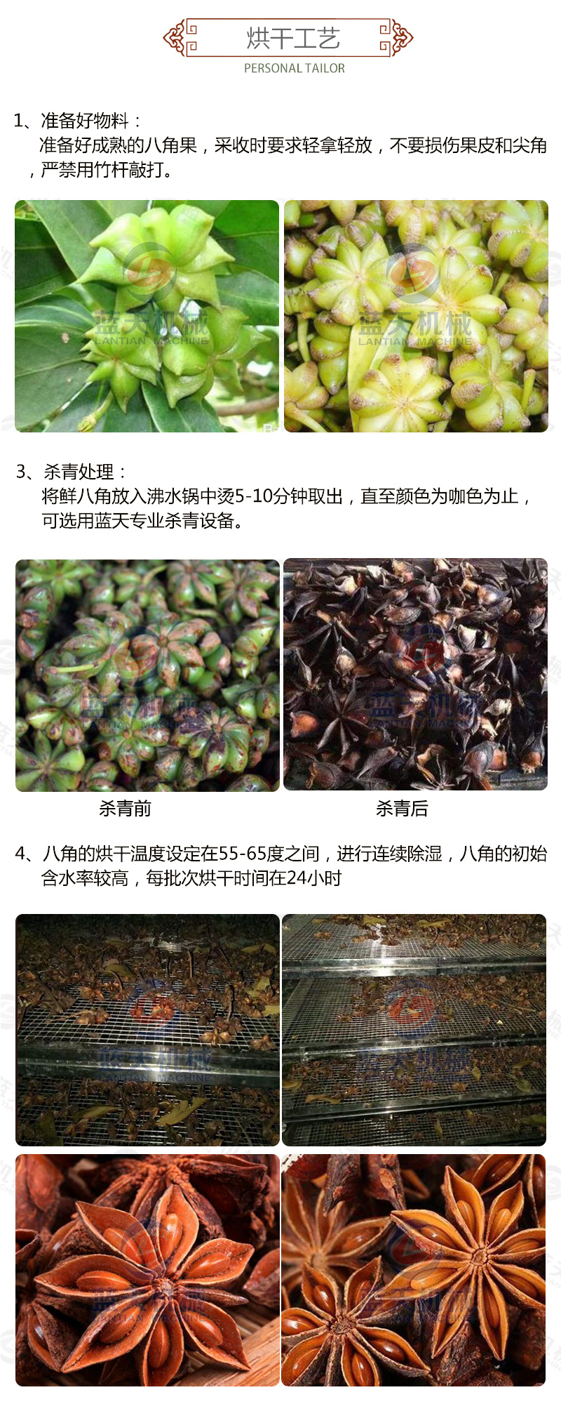 八角需要干燥脫水,老百姓們傳統的干燥就是看天氣,靠太陽曬的方式,或者燒柴的方式較為普遍,這兩種方式的主要問題在于,一,干燥時間長,一般在4天以上。二,所需干燥場地較大,干燥時間受天氣制約。第三,不節能環保。