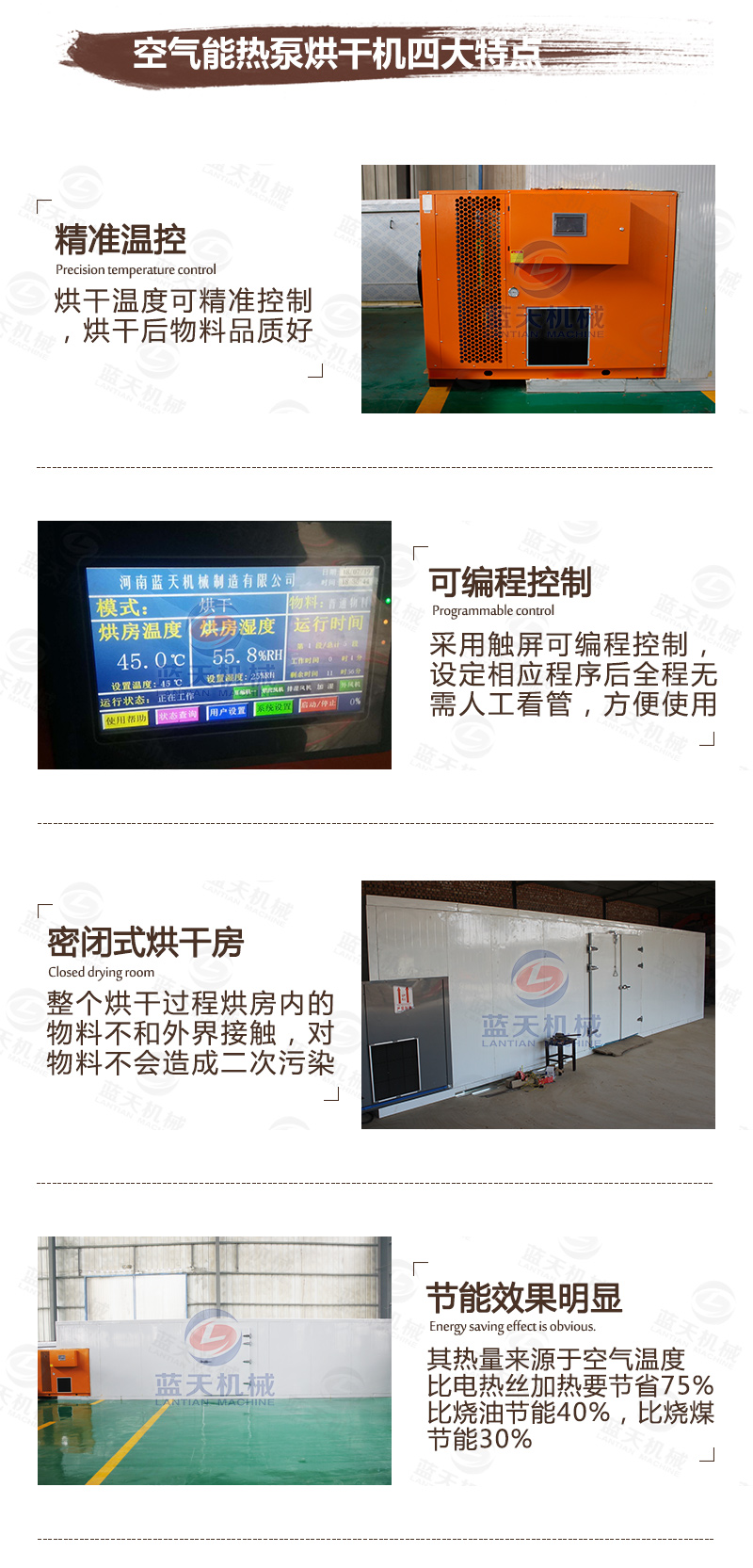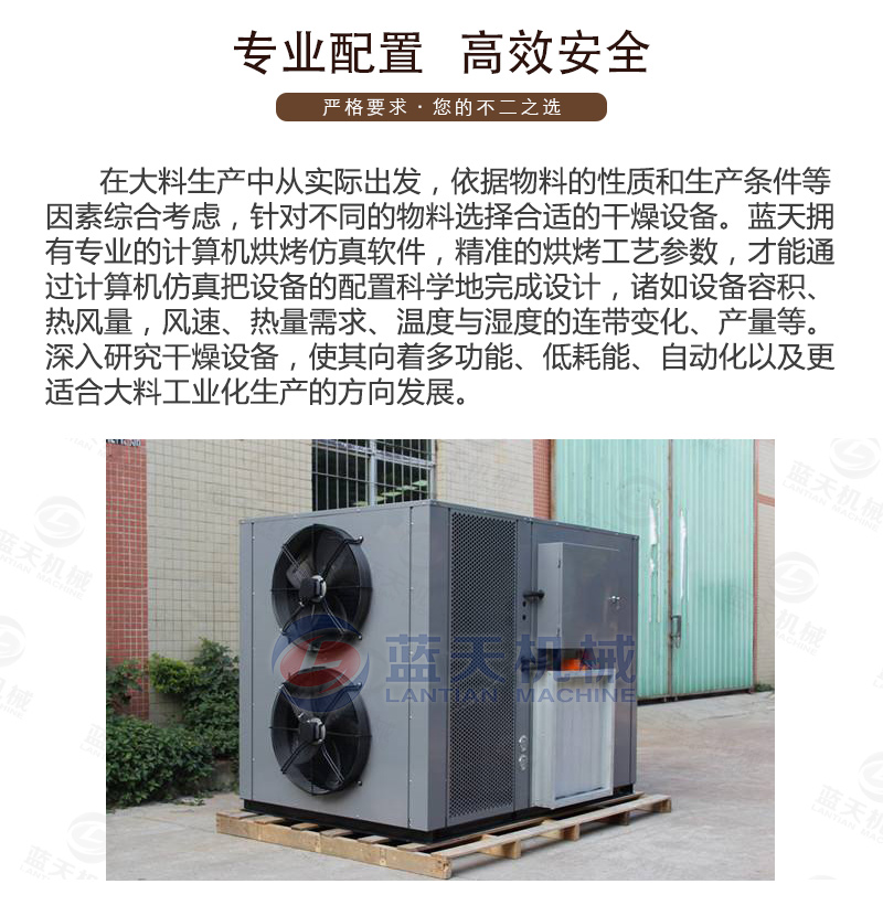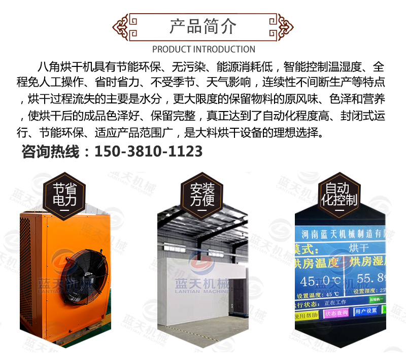 結合以上問題,新的八角烘干機出現了,這種設備是通過少許電能驅動壓縮機做功,從而使系統中的冷媒吸熱放熱來實現熱量從高位轉移到低位的新能源設備,是一種氣流干燥設備,節能環保,智能化控制,不再看天氣,不再需要人守著,一鍵啟動,自動烘干,自動停機。