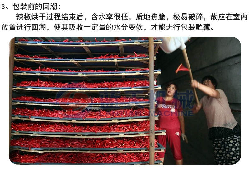 五:辣椒經(jīng)辣椒烘干機(jī)烘干后,選檢要在干辣椒自然回潮一段時(shí)間后進(jìn)行,否則干辣椒容易破碎;