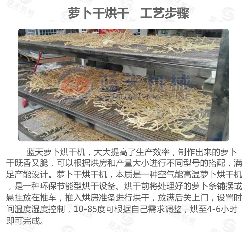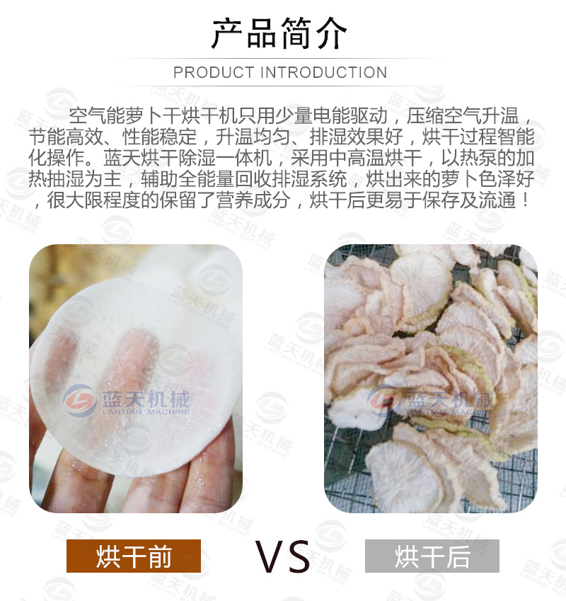 蘿卜干是一種風(fēng)味、具有悠久歷史的食品。傳統(tǒng)蘿卜干加工采用是風(fēng)脫水的方法,利用日照和風(fēng)力,加速蘿卜的蒸騰作用,使蘿卜大量脫水,并利用鹽的高滲透壓來(lái)保存。我們介紹一種基于空氣能技術(shù)熱風(fēng)烘干的蘿卜干烘干機(jī)代替日曬來(lái)加工蘿卜干,加快蘿卜干加工過(guò)程。